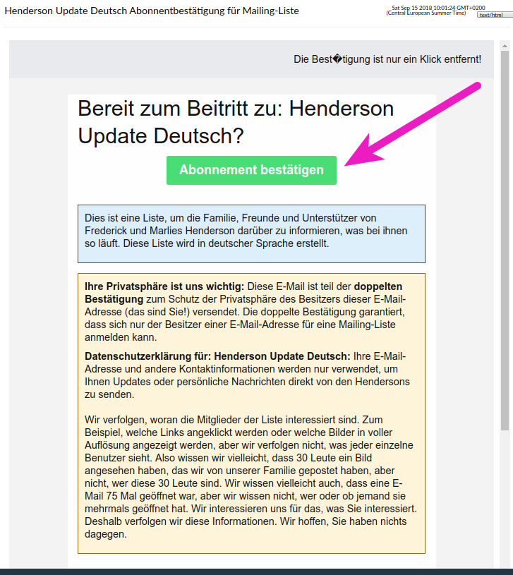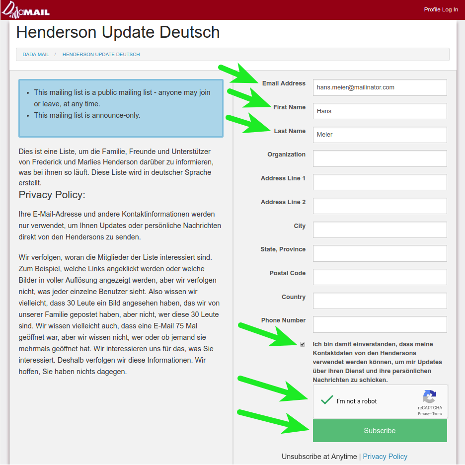 Wenn Sie daran interessiert sind, E-Mail-Updates von den Hendersons zu erhalten, können Sie sich auf der Registrierungsseite der E-Mail-Liste anmelden. Es wird nur Ihre E-Mail-Adresse benötigt, aber wir bitten Sie, auch die Felder Vor- und Nachname auszufüllen. Bitte lesen Sie unten den Abschnitt Closed-Loop-Opt-in, damit Sie den Prozess der Anmeldung verstehen.
