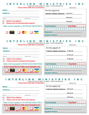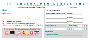Mailing slips are provided below to be included with your donation. These are have our name printed on them for your convenience. If you would like to give to other Interlink Ministries missionaries please use the donation slips from the Interlink Ministries Website.