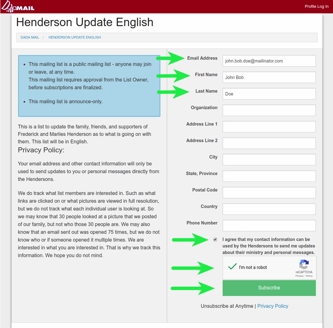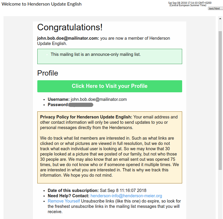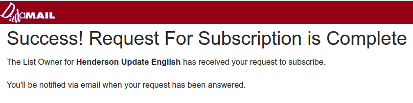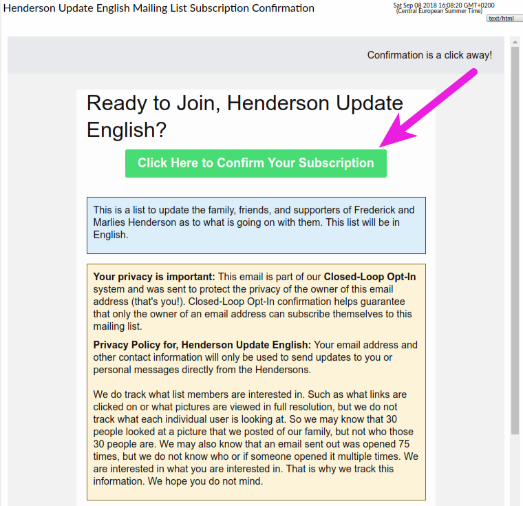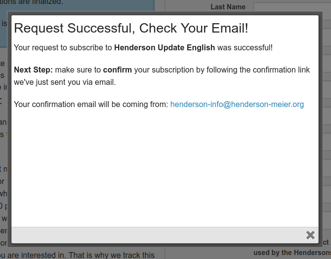 If you are interested to receive email updates from the Hendersons you can sign up on the email list sign up page. Only your email address is required, however we kindly ask that you also fill out the first and last name fields as well. Please read the section: Closed-loop Opt in below, so that you will understand the process to subscribe.